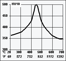 Hardness/Temperature tempered for 4 hours after austenitizing at 1040°C (1904°F) for 30 min quenched 100°C/sec (212°F/sec).